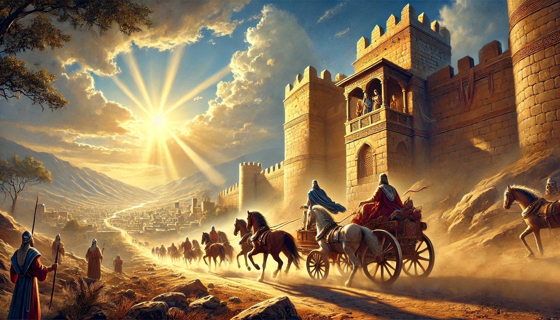 King Joram is lying wounded in Jezreel after being injured in battle. Ahaziah, king of Judah, is also visiting him there. Jehu sets out for Jezreel. The watchmen on the towers recognize his wild driving style — an early sign of his determined character. Joram sends messengers, but none return; they join Jehu instead.