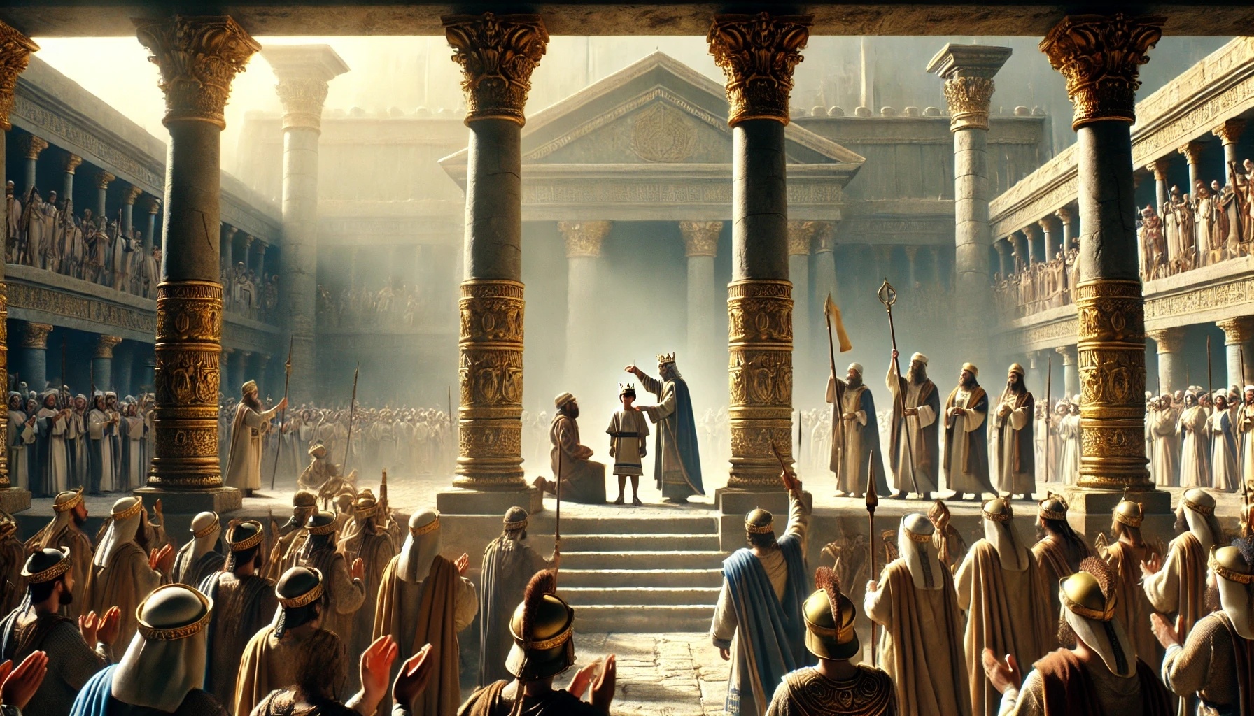 These years are marked by patience and quiet trust. Jehoiada waits for the right moment. Finally he devises a bold plan. He gathers the commanders of the royal guard and binds them by oath to the cause of the rightful king. In the temple he organizes a carefully planned ceremony in which the young Joash is publicly presented as king.