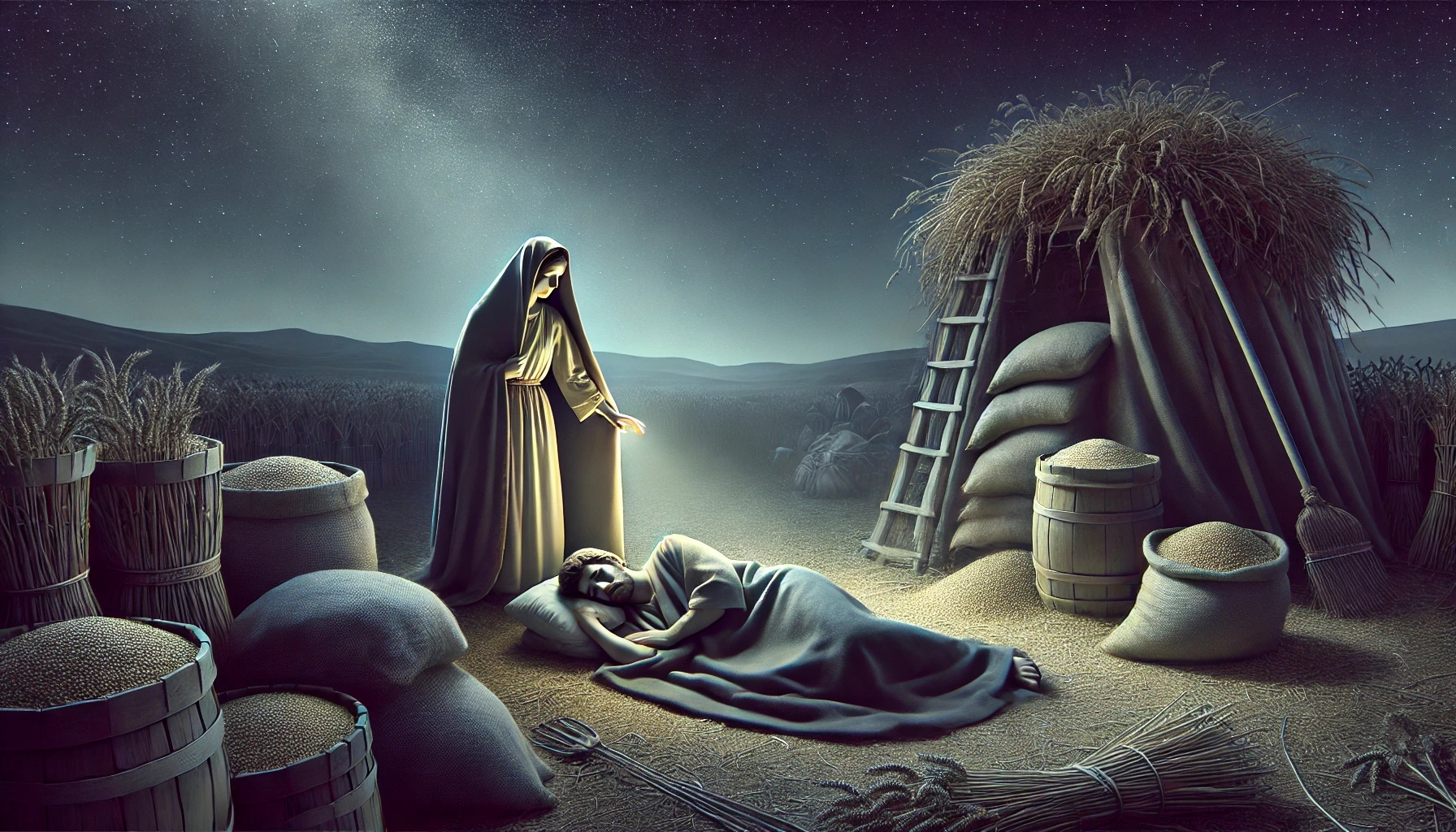 Naomi, the wise and caring mother-in-law, realizes that the time has come to provide Ruth with security and a home. In her love for Ruth, she plans something daring: Ruth is to go by night to Boaz on the threshing floor – not to seduce him, but to present herself to him in a respectful and symbolic way as one in need of a kinsman-redeemer.