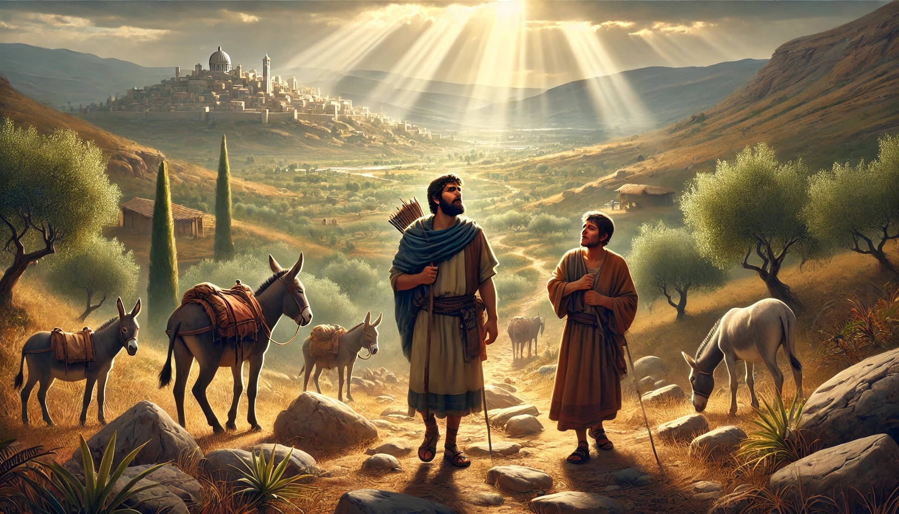 When the donkeys of his father Kish are lost, Saul sets out with a servant. They travel through various regions and search for daysโwithout success. The journey becomes exhausting, supplies run low, and Saul wants to give up. His concern is for his father, who by now is likely more worried about his son than about the animals.