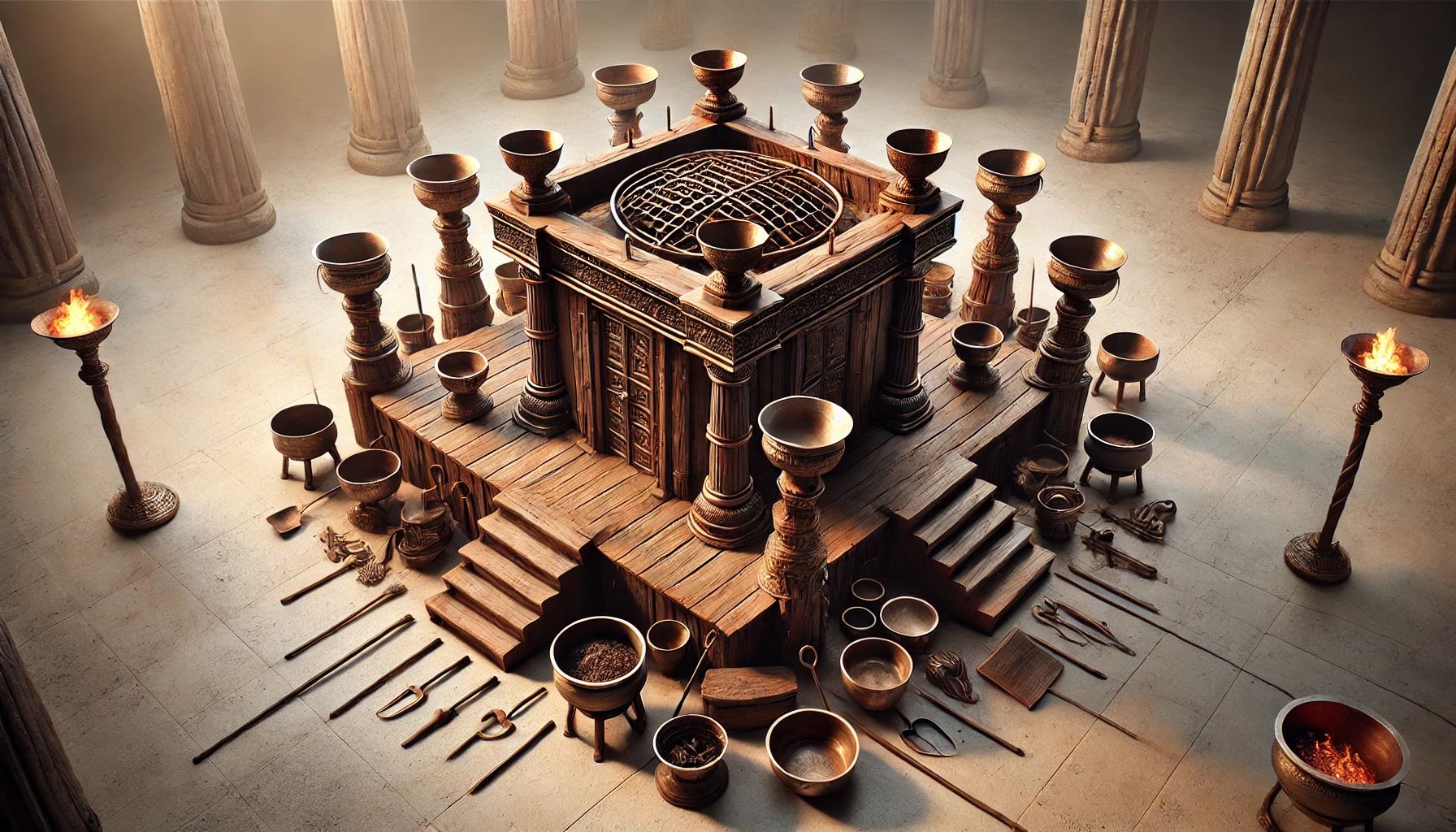 The altar stands at the center of the courtyardβmade of acacia wood overlaid with bronze, with βhornsβ at each corner. It symbolizes the means of atonement between God and humanity.