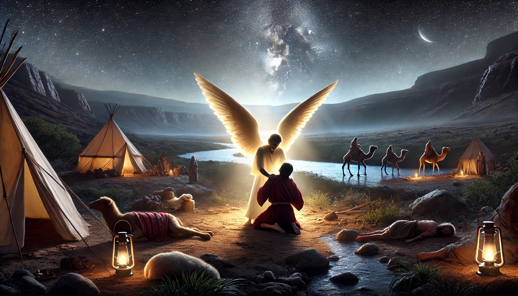 Jacob meets God’s angelsβ€”as he did at Bethelβ€”and names the place Mahanaim (β€œTwo Camps”), hinting at both the angelic host and his divided family. This divine encounter fortifies him for the coming test.